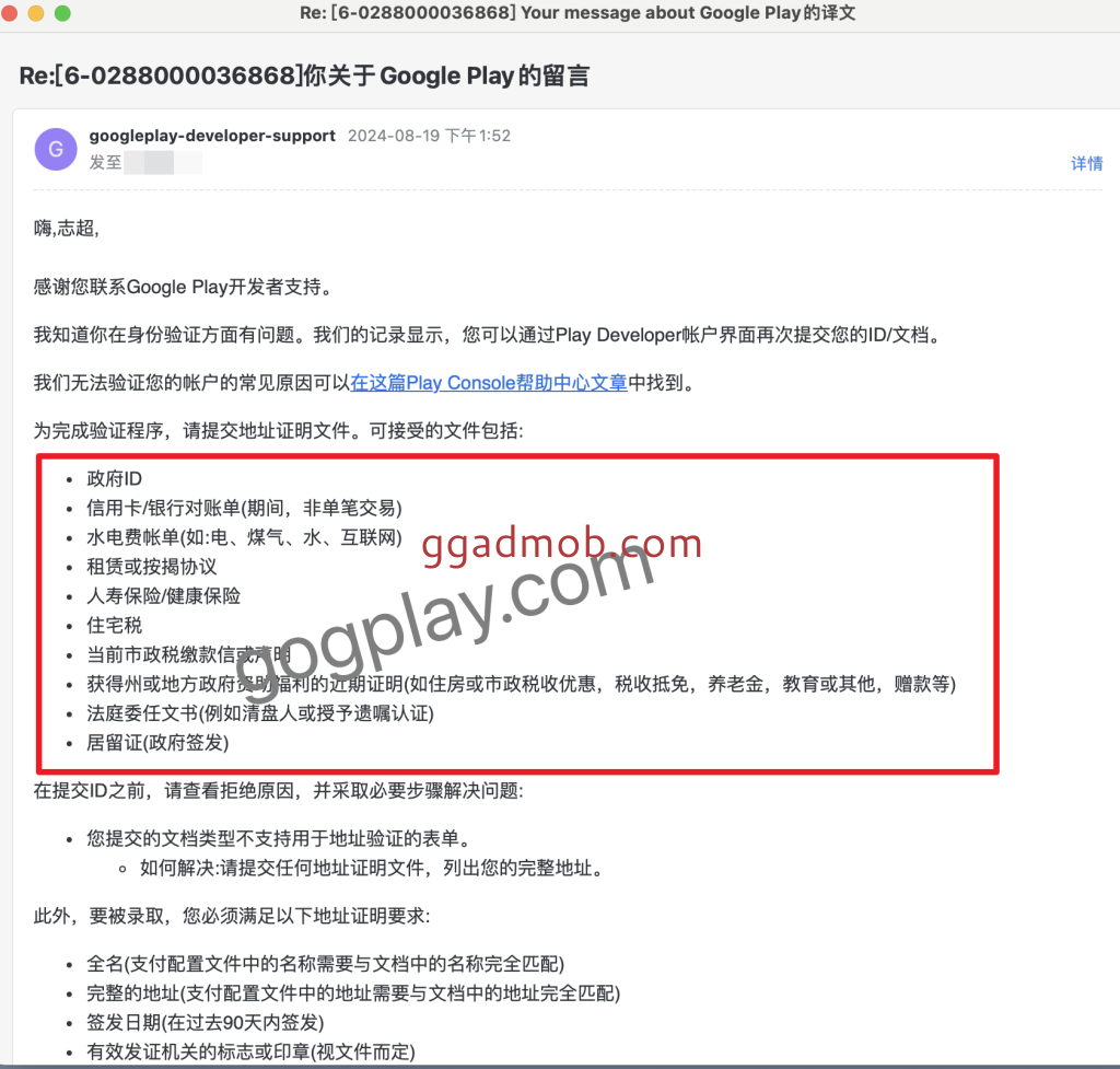 下面为英文版翻译的邮件截图,分别为两个不同的客服邮件。下面英文版的在邮件中提到被支持的文件还挺多的,有10种材料都能被用于证明,如下图。