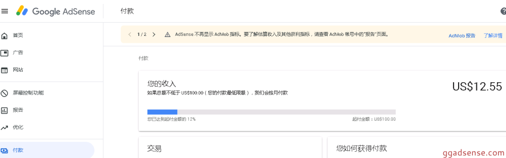 看到了没有?adsense这边付款页面的余额收入也是12.55美元,证明这两个平台的账号实际是完全相同的,甚至连收入都是合并了的。