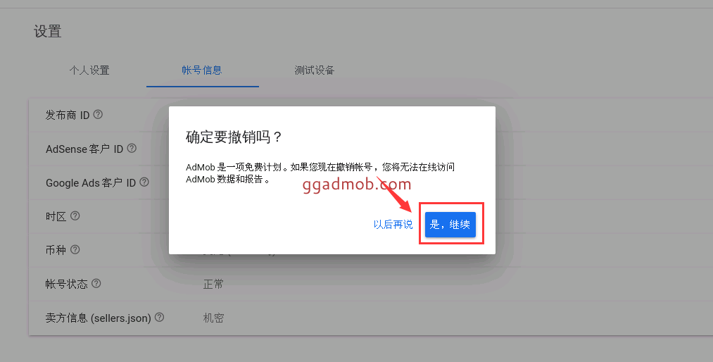 首先我们进入admob账号,左侧菜单栏-【设置】-【账号信息】-【右下角撤销账号】