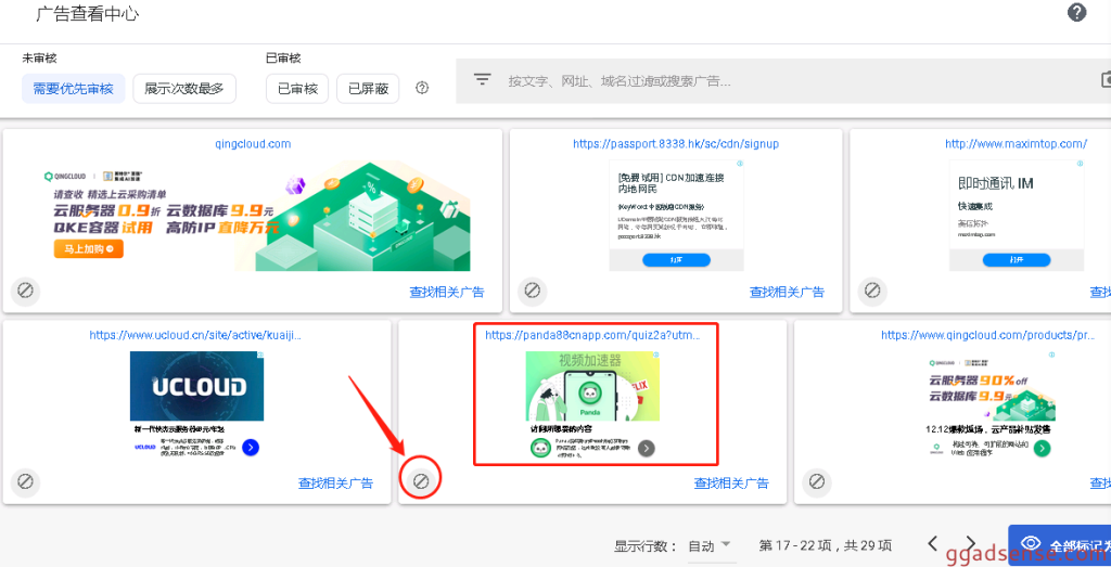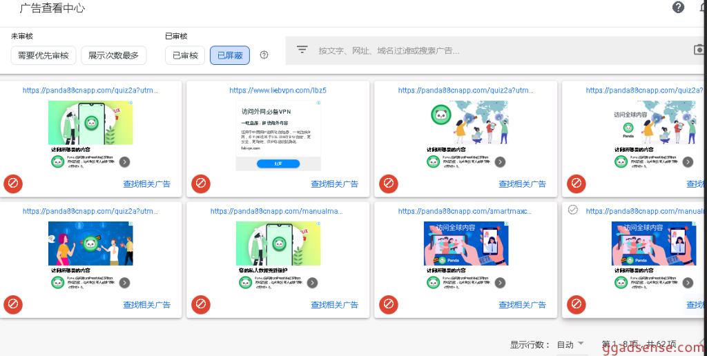 依次操作屏蔽以后,我们来到已屏蔽类目,可以看到所有已审核屏蔽的广告,这些广告我们很有必要及时审查。