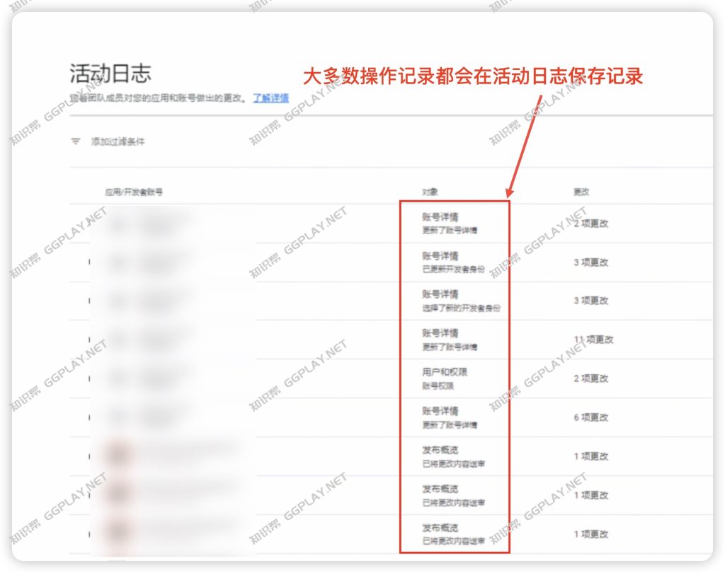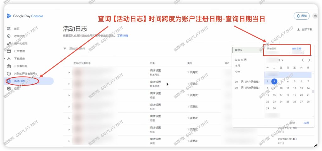 在谷歌开发者后台,查看【活动日志】右上角查询范围从账户注册日期到当日,能清楚的看到绝大多数操作信息的记录情况,如下图。