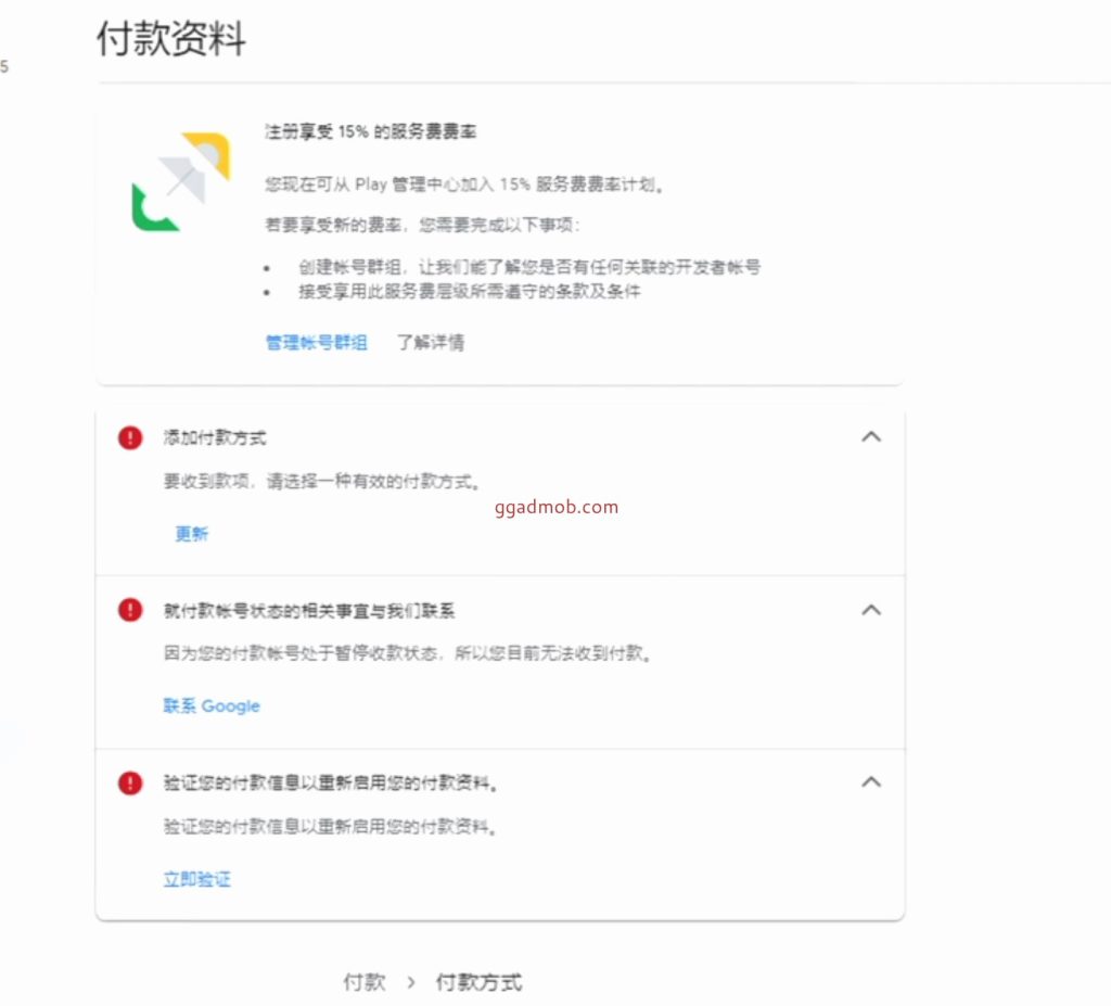 “验证您的付款信息以重新启用您的付款资料“这个提示需要我们验证Google账号原来绑定的收款银行帐户,如果不能提供原始卡号的验证,账号将无法继续使用,余额也将无法继续支付给我们 。