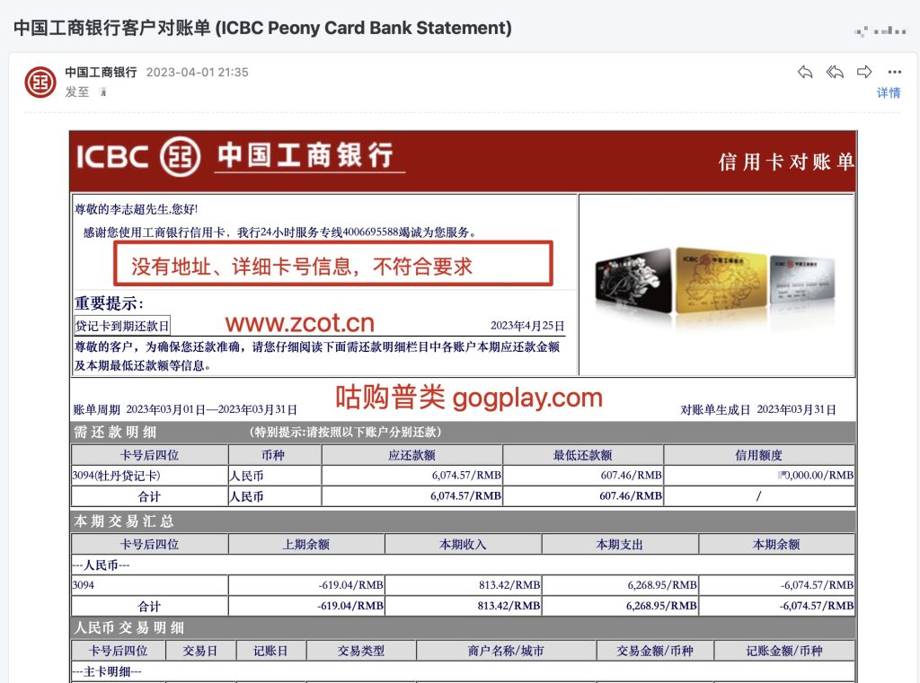 下图为工行信用卡对账单,对账单直接在邮件里面以html网页形式展现出来,没有单独的电子版pdf,页头也没有地址信息,所以不符合要求,无法用于地址证明。