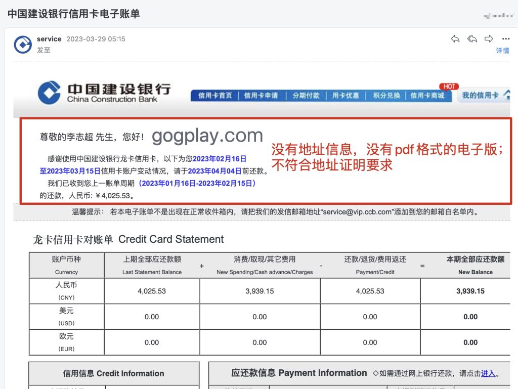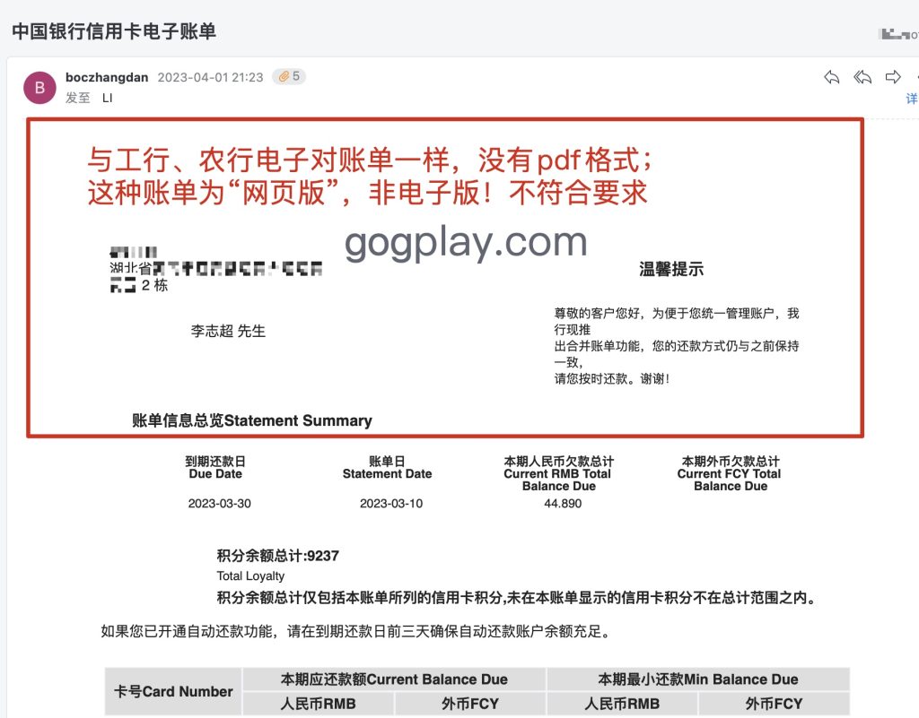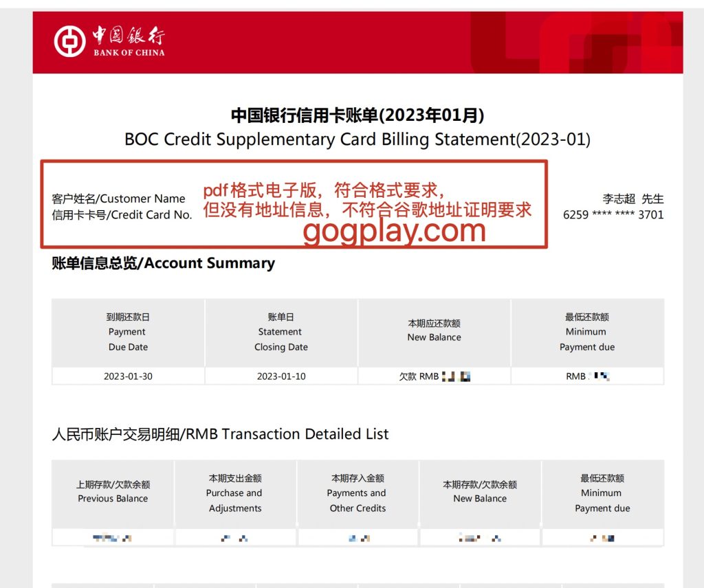 下图为中国银行信用卡对账单,文件格式符合要求,可惜页头没有地址信息,所以无法用于谷歌地址证明