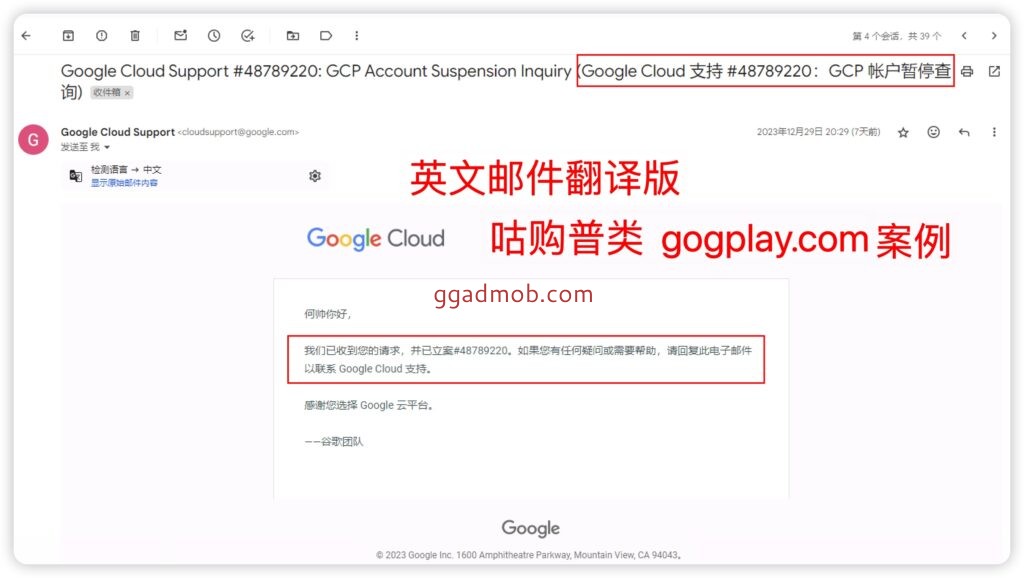 通过GCP帮助中心,找到专属的申诉联系表单,提交了各项信息之后,成功建立工单邮件,如下图