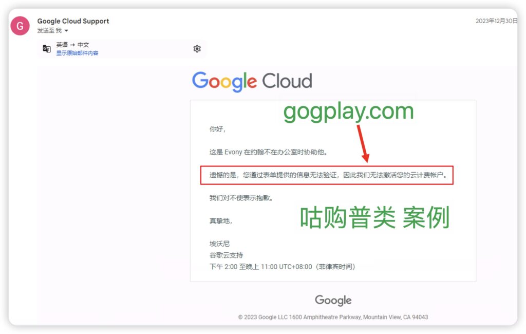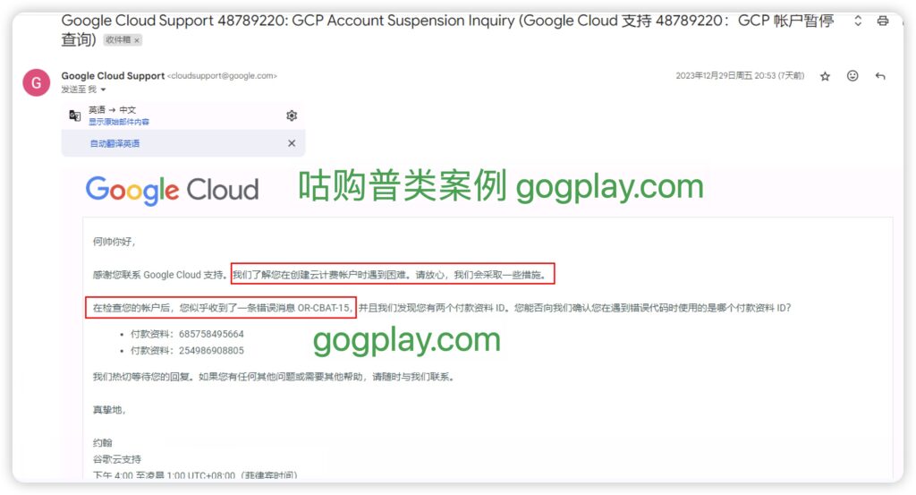 邮件人工客服回应,让确定要使用哪个付款资料来使用谷歌云,并且出现了错误代码,如下图