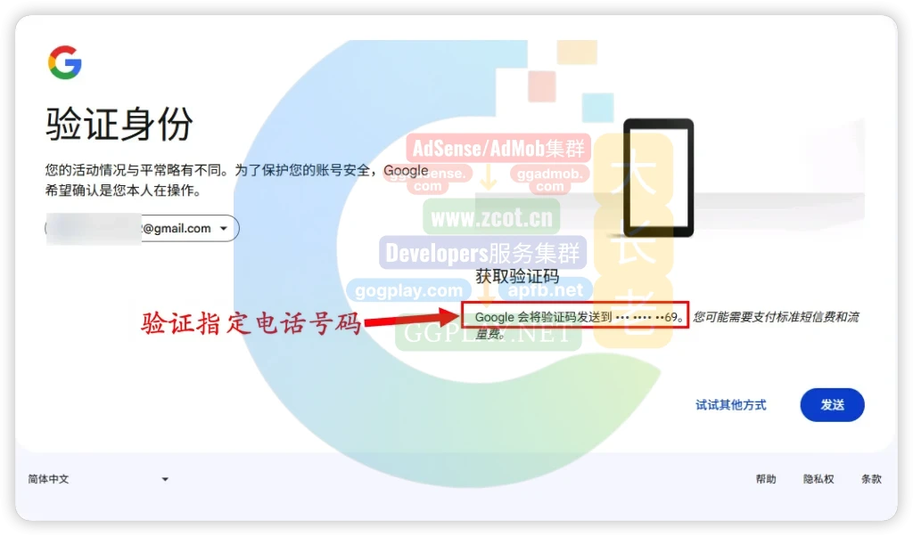 验证身份,您的活动与平常略有不同,为了保护您的账号安全,Google希望确认是您本人在操作,获取验证码,Google 会将验证码发送到…….指定电话号码,如下图。